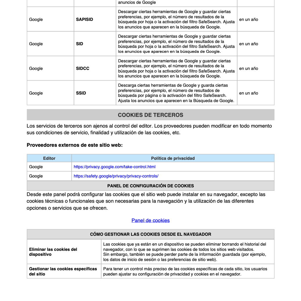 COOKIES UTILIZADAS EN ESTE SITIO WEB