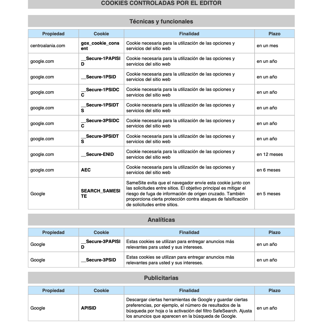 - Cookies propias: son aquellas que se envían al equipo terminal del usuario desde un equipo o dominio gestionado por el propio editor y desde el que se presta el servicio solicitado por el usuario.